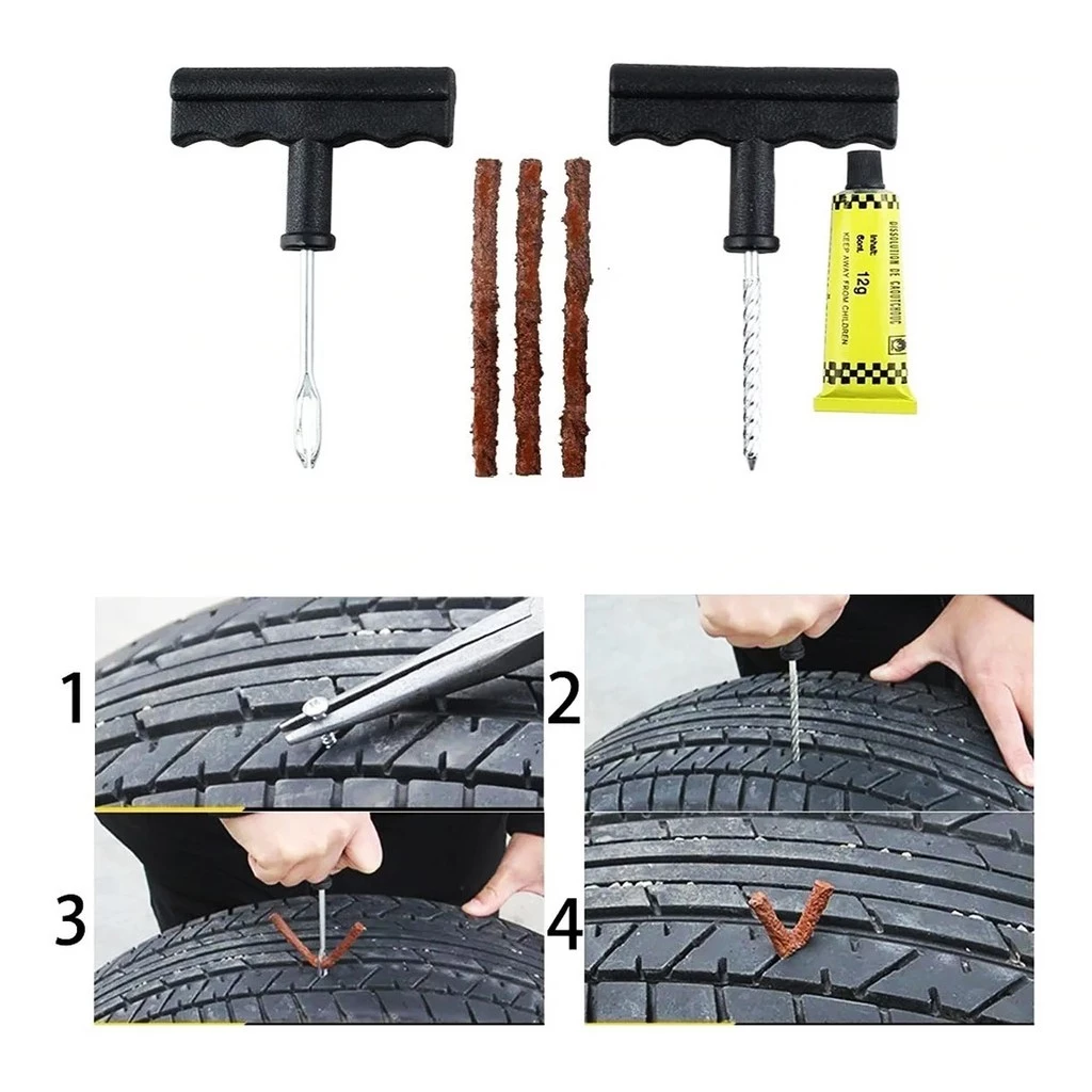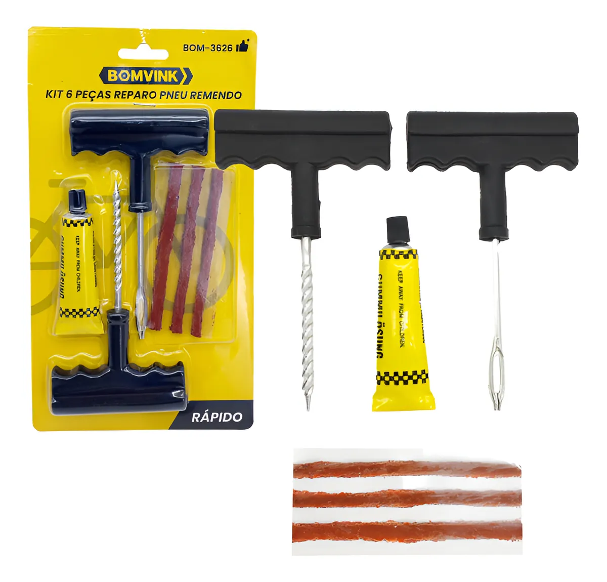 Informações Adicionais: Ideal para emergências e manutenção rápida de pneus, o Kit de Reparo de Pneu Bomvink BOM-3626 é composto por 6 peças essenciais: ferramentas em T para escarear e aplicar o reparo, tiras de borracha para vedação e um tubo de cola vulcanizante. Compatível com pneus sem câmara (tubeless), é fácil de usar e perfeito para manter no carro, moto ou oficina.