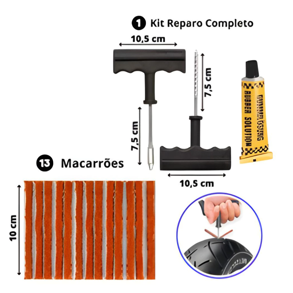 Ficha Técnica: Composição do kit: 1 ferramenta em T com lima (escareador) 1 ferramenta em T com aplicador (agulha) 1 tubo de cola vulcanizante 3 tiras de borracha selante Compatibilidade: